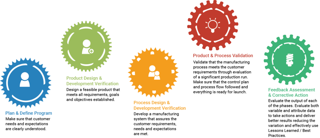 There are 5 phases within the APQP process, each phase happening simultaneously with at least one other while giving output in each phase for input for the next one (see figure 1):